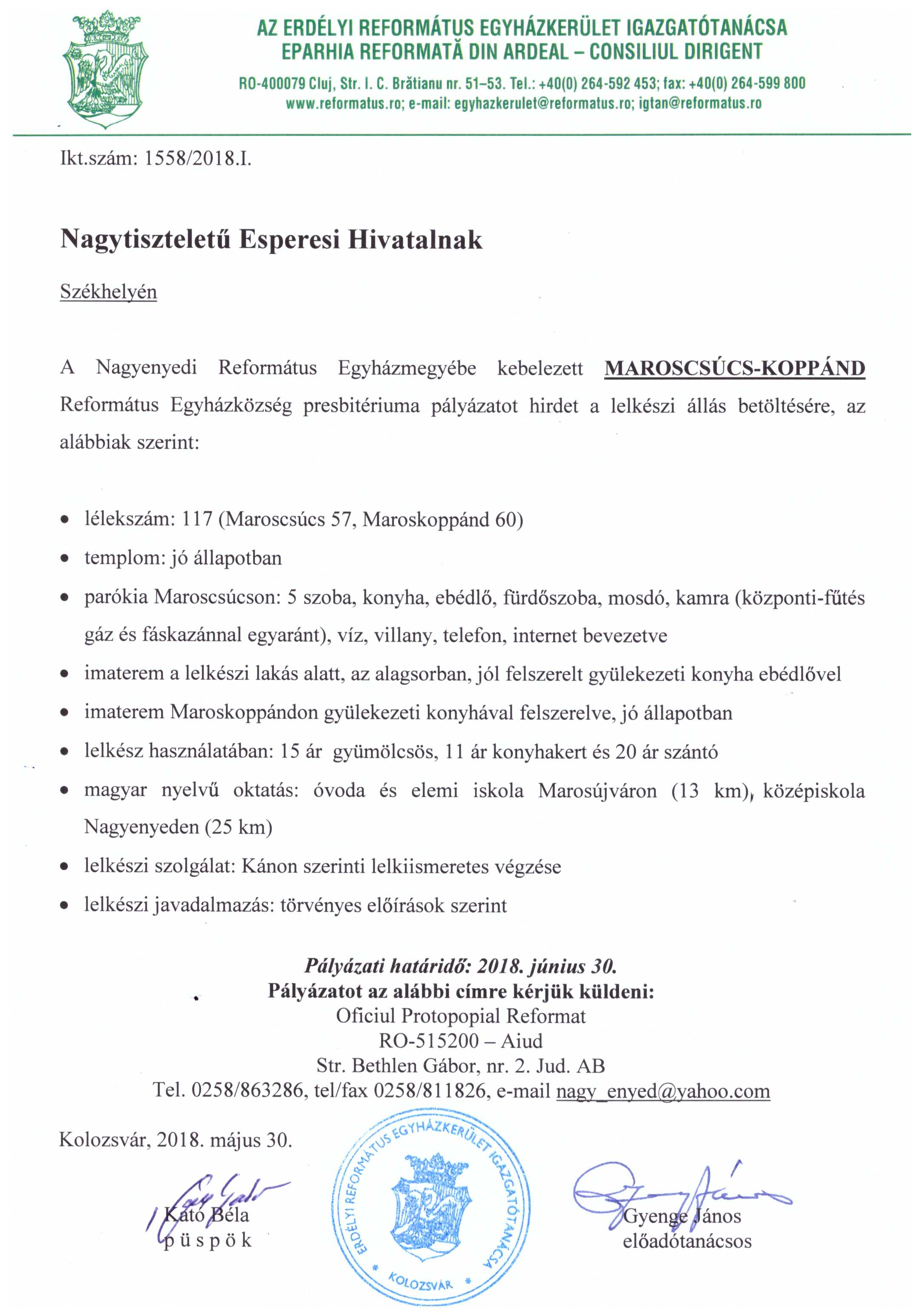 Pályázat - MAROSCSÚCS-KOPPÁND - Lelkészi állás