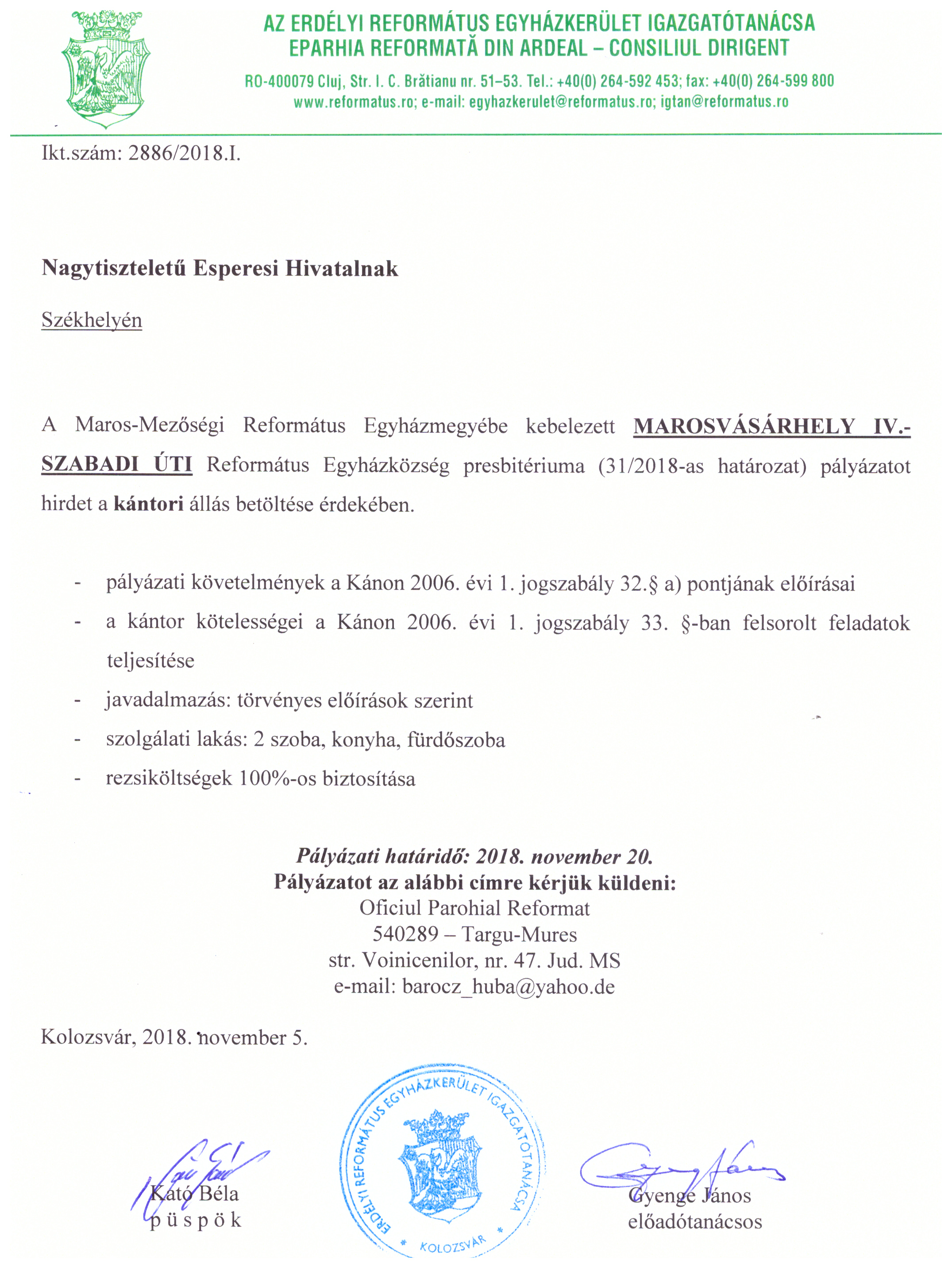 Pályázat - Marosvásárhely IV.- Szabadi út - Kántori állás